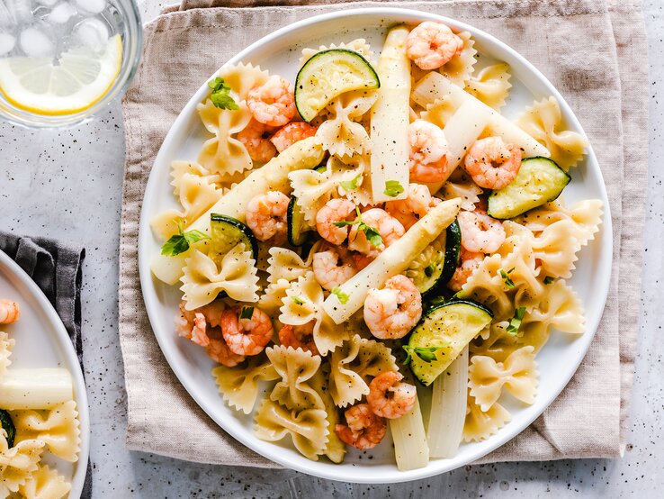 Nudelsalat mit Spargel und Shrimps: Feinschmecker-Futter der Saison