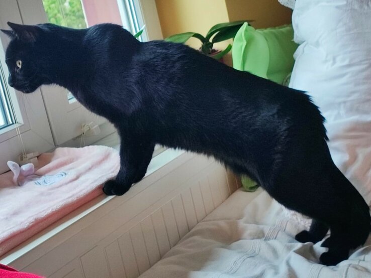 Schwarzes, seidig glänzendes Fell: Ein hübsches Kerlchen ist Sandor. Der große, stattliche Kater kommt in der Tat mit einer eleganten Anmutung daher, schmust dabei aber sehr gern und lässt sich am liebsten am Kopf kraulen. Oft legt er dann den Kopf in die Hand, eine rührende Geste. Am Bauch gekrault zu werden, mag er hingegen nicht so arg. Große Freude wiederum bereitet es ihm, wenn sein wunderbares Fell gebürstet wird.